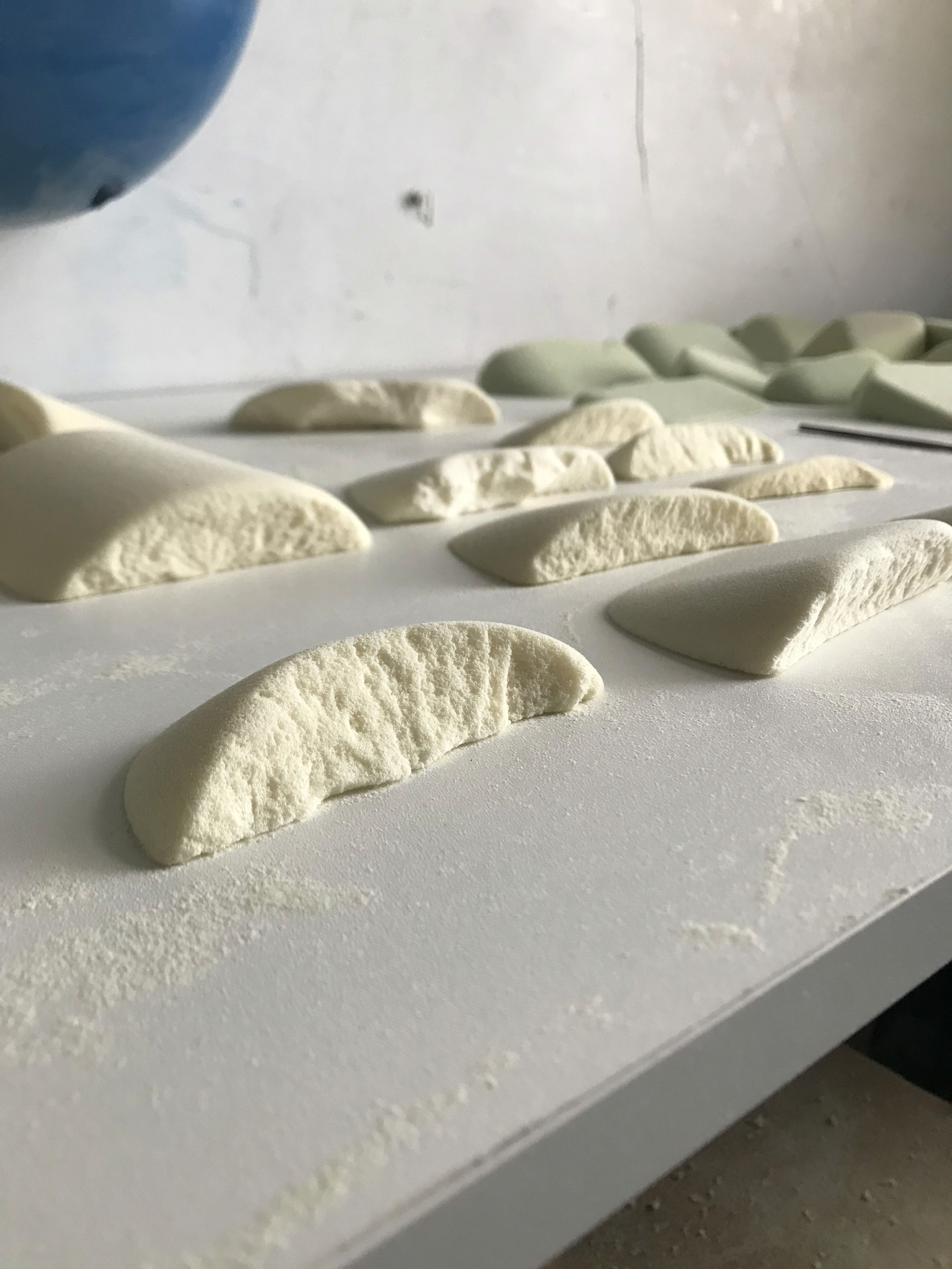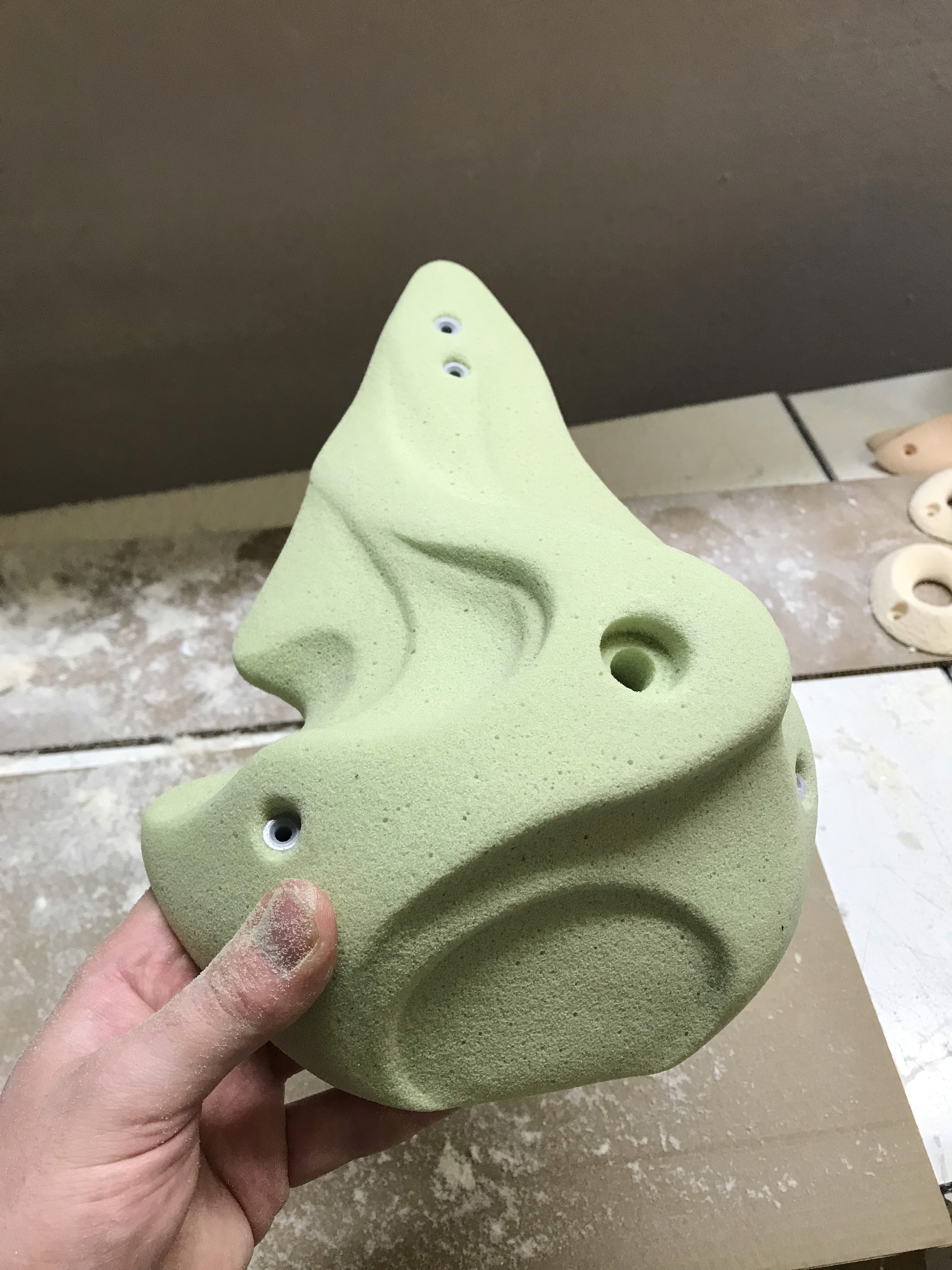 The process starts with sculpting shapes from rigid polyurethane foam. If destined to be a cast resin hold, a silicone mould is made from the foam shape to be poured into once set. If destined to be made from fibreglass, the patterns are prepared with a high build primer paint and sanded to the desired glossiness. A fibreglass mould is made of the pattern from which the final holds are eventually cast in fibreglass - with thickened resin areas around the screw holes and metal reinforcements for added strength. The texture for the fibreglass holds is often a fine aluminium oxide blasting medium sprayed onto wet paint or resin via an air compressor in multiple even layers.